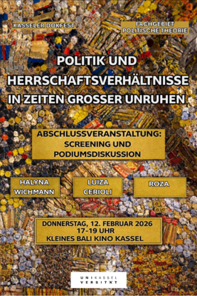In der Abschlussveranstaltung der Vorlesung „Was ist Politikwissenschaft?“ der Uni Kassel präsentieren die Studierenden ihre selbst produzierten Kurzfilme, die gesellschaftliche und politische Themen wie Migration, Geschlechterverhältnisse und soziale Bewegungen beleuchten. Danach gibt es Gelegenheit, über die Filme ins Gespräch zu kommen, und es findet eine Podiumsdiskussion statt, in der zentrale Fragen zur filmischen Darstellung politischer Themen in den aktuellen Zeiten großer Unruhen diskutiert werden.